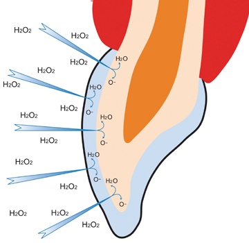 El proceso de blanqueamiento dental se da gracias al ingrediente activo en el producto, que comúnmente es peróxido de hidrógeno o peróxido de carbamida. El esmalte de los dientes es penetrado por el ingrediente activo que elimina las moléculas descoloridas mediante la liberación de moléculas de oxígeno, con lo que se produce una separación molecular que les permite al oxígeno esparcirse y así generar una apariencia de blancura en los dientes.