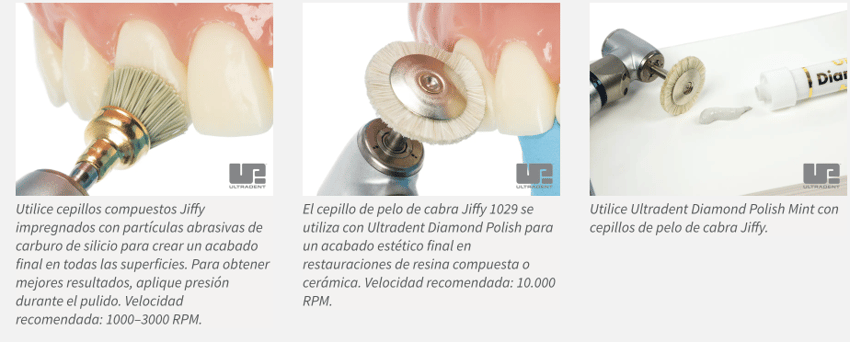 Velocidad de los cepillos: 1,000 – 3,000 RPM - Pulido Final: Finalice con el cepillo de pelo de cabra Jiffy™ y el pulidor Diamond Polish Mint de Ultradent™ para un acabado de alto brillo que imita el esmalte natural.
